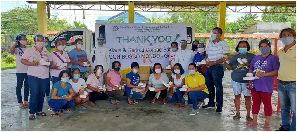 The Educating Community of Laura Vicuña Women Development Training Center had the chance to share its blessings to one of the poorest families in Victorias City as the Community joined the 28th National Family Week spearheaded by the City Social Welfare and Development Office last end of September, which the very objective of this “Adopt-A-Family” Program is to help selected families alleviate their mental, psychological and economic stress.The collaborative efforts of the Sisters, teachers, staff and support personnel made the early “Gift-Giving” materialized where the recipients Lola Tereseta D. Basco together and her grandson Christian received rice, home apparels, goods, foods and cash. This 74 year–old hardworking Lola used to gather seashells at “Baybay” and sell it to sustain their everyday living as she also takes care her grandson. She is a widower and lives in a small simple house at Purok 8, Brgy. 9, Daan Banwa, Victorias City. Very much surprised with such great blessings, Lola Tereseta could not but repeatedly uttered her word of “thanks” as she said “Thank you Sisters and SCWD for these wonderful gifts that you gave us. It is a big help especially for my grandson. May the Lord keep you healthy, safe and blesses you the more” October 5, 2020, Laura Vicuña Women Development Training Center Community distributed lunch included fried chicken, pancit with rice and cheese burger for snacks to all the dedicated frontliners (Barangay Police and Tanods, BFAT, Guards, Traffic enforcers, Gasoline pump boys and Victorias City Domestic Repatriation Information Center Personnel) of Victorias City. Everyone was surprised and thankful to be one of the recipients of the Don Bosco Mondo Project.